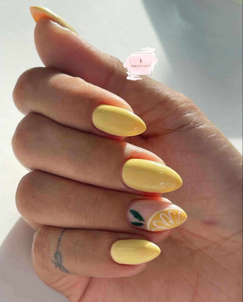 The zesty allure of citrus has been brilliantly portrayed on these short almond nails which are done in a sunrise gradient of yellow and orange color. One nail makes the design even more interesting as it displays a citrus slice illustration that reflects the freshness of summer mornings. With that kind of design, a warm white linen dress and a glass of juice would be the best things to have.
