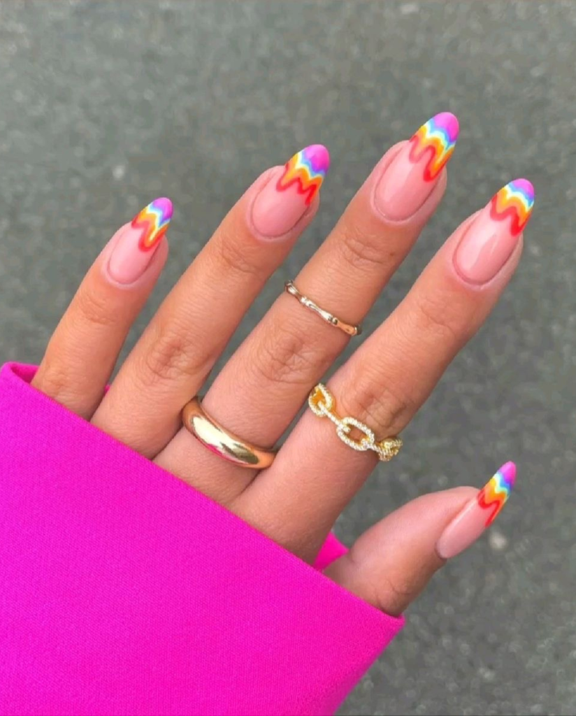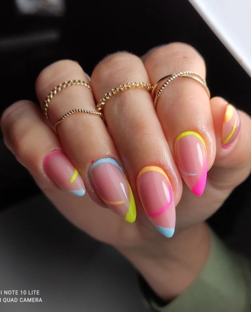 Draw people’s attention to your style with these long almond nails decorated with colorful neon shades that look like they are dancing with life. These nails are a tribute to speed and dynamic motion, making them perfect for a summer festival atmosphere or any area where they are surrounded by music and laughter.