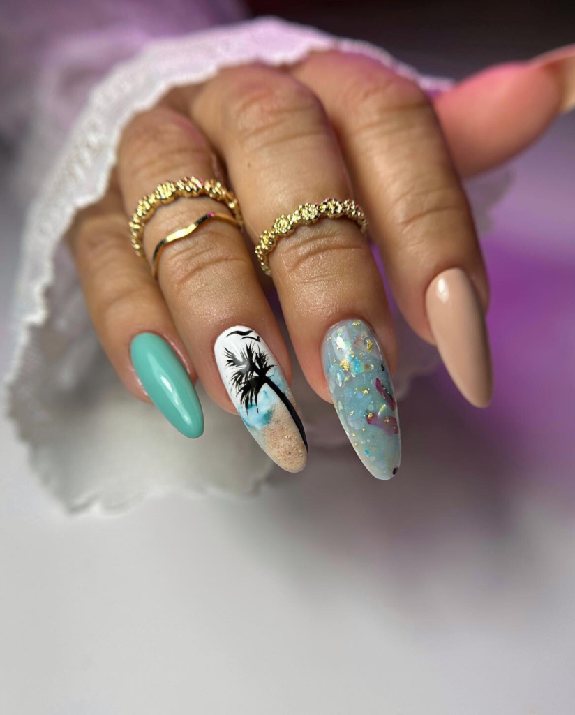 Inspired by the refreshing caress of the ocean waves, these elongated almond-shaped nails depict the harmonious blend of various shades of blue along with the sparkle of ocean foam. One particular nail stands out with a palm tree silhouette against the soft light of twilight, expressing the serenity of a beach at sunset. This design is for the ones who have the ocean in their souls and, thus, transfer the gentle whispers of the sea to others.