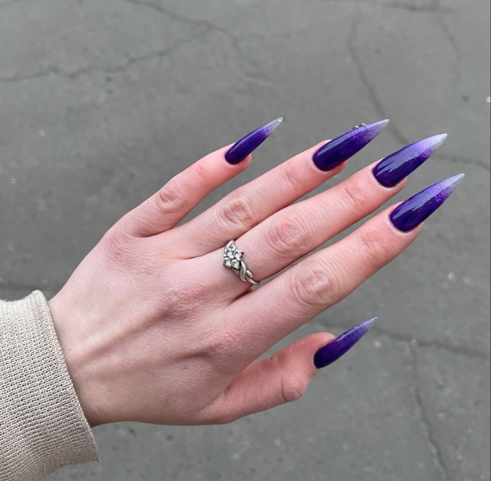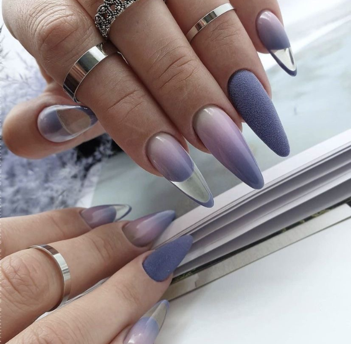 A combination of cool lavender and a frosted matte finish, this design is a perfect match where long nails are the canvas for a wintry romance. It is a beautiful choice mixed with silver jewelry and monochrome outfits. The crescent of clear nails by the cuticle is the depth, but the texture matte top layer is twist to the classic purple palette. This style is evoking the cool winter charm, therefore, it will be widely worn to the season’s parties.