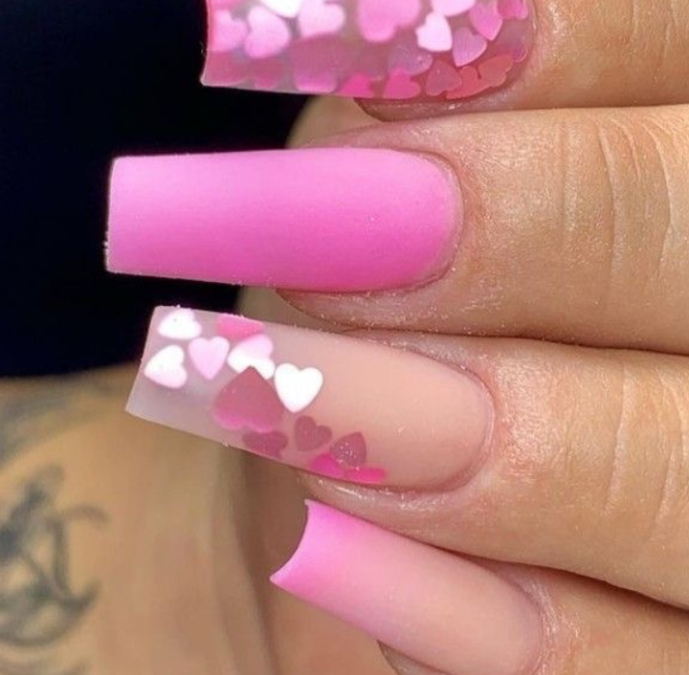 These short nails are a carnival of pink splendor. Entering the fun and charming world of these short nails is like entering a colored world of pink. Wearing a matte coat, these nails get a sprinkle of hearts that change from a solid candy pink to a clear tip that is love-struck. Who but the ones who identify with their teenage years and express their feelings boldly would take on this design? It is just the right touch to wear going for a casual coffee date or a shopping spree, and it can be paired perfectly with light denim and a tank top that is freely fitting so that the whole outfit is fun and cheery.