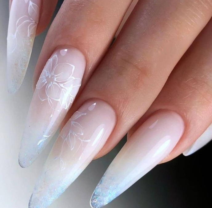 Embrace the whisper of spring with these long, almond-shaped nails featuring a delicate white floral design over a clear-to-white ombre base. The touch of iridescence brings to mind the gentle shimmer of morning dew. This design resonates with the soft-spoken yet sophisticated woman. When paired with a flowing white sundress and straw hat, it’s a testament to grace and poise, perfect for a garden party or an elegant outdoor wedding.