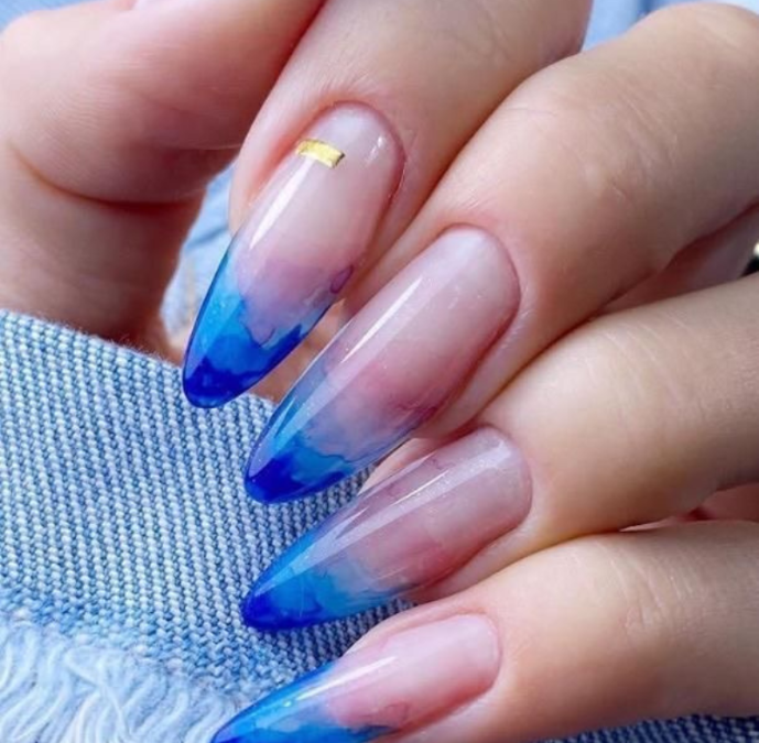 If you are one of those people drawing inspiration from the sea and its beauty, these long nails are a deeper dive into the oceanic blues. The ombre that goes from clear to sapphire is just like the light going through the water, and a gold band symbolizing the sunlight from above completes this design. The design is so simple yet so full of depth, therefore, it would suit moments of solitude and also evening gatherings. Cool-toned, flowing silks, and satins would be the most appropriate pairing with it, thus creating a mesmerizing outfit giving rise to the details of the mystery of the ocean.