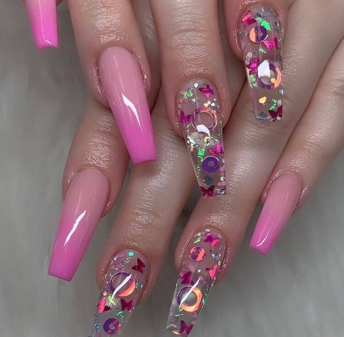 Vibrant pink and clear acrylics combine together with fluffed multicolor glitter and sequins to form a zigzag spectacle. The long coffin-shaped nails are like a dazzling party on your fingertips that can be worn on Christmas or any event that desires to be extra bright. It brilliantly reinforces the black dress, with the addition of your nails being the most attractive thing at the party.