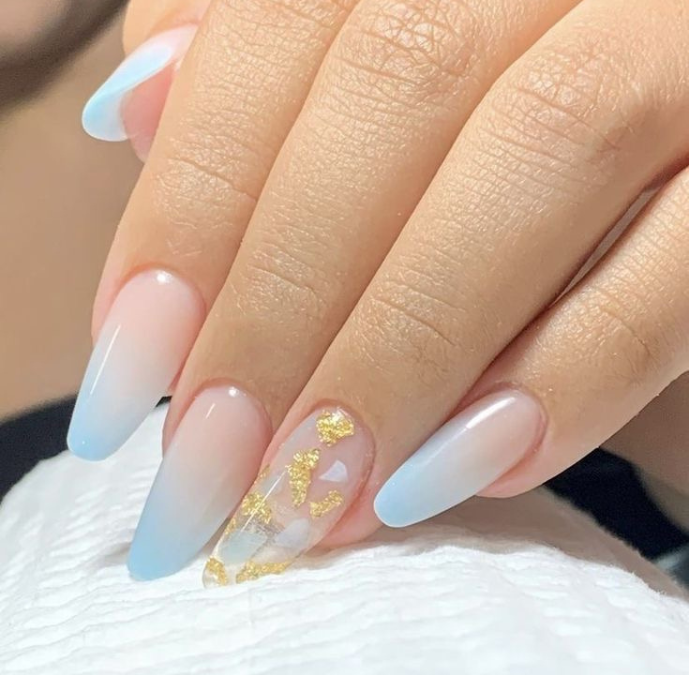 The design not only promotes a clear sky in a very soothing manner but also comes with a slight white to baby blue gradient. The use of gold leaf on such a simple design gives a rich and luxurious feel to the design, thus, it can be described as both peaceful and posh. These nails, which are long and almond-shaped, are a great way to express an interest in luxury items without being too formal. These nails are perfect for a summer holiday or a relaxed brunch and they will go beautifully the white linen outfit or a soft blue scarf.