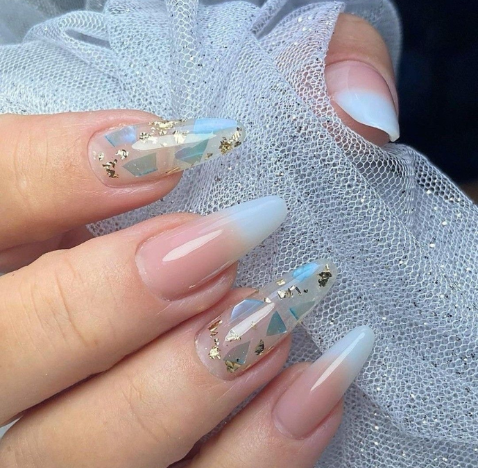 A wonderful coalescence of milky pink and aqua blue is presented by this heaven of a long nail with the gradual blend of both colors. The one-feature nail attached with gold flecks and sky-blue sequins enriches the classic pastel look with a special touch. This project is for those people who value discreet beauty but with a twist of the unexpected. It undoubtedly is the best choice for a classy high tea gathering or casually wandering through the upper crust boutiques in the city.