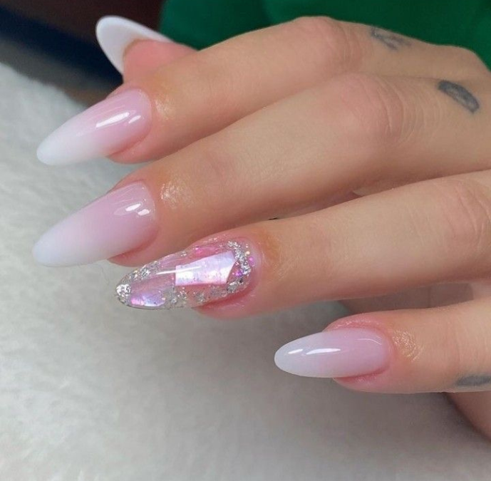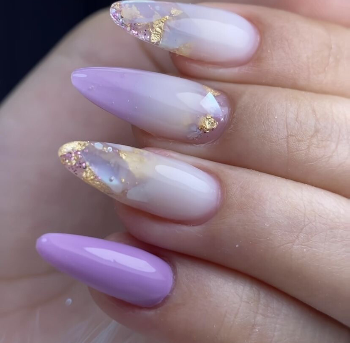This long almond-shaped nail with a glossy lavender-to-milk color transition is enhanced with a sprinkle of gold. The soft, smooth color transition you are looking at these long almond-shaped nails, is a symbol of the luxury and simplicity style that is so quiet. They’re an ideal addition to a soft, pastel ensemble or a strong but not pushy business suit, justician personal pleasure.