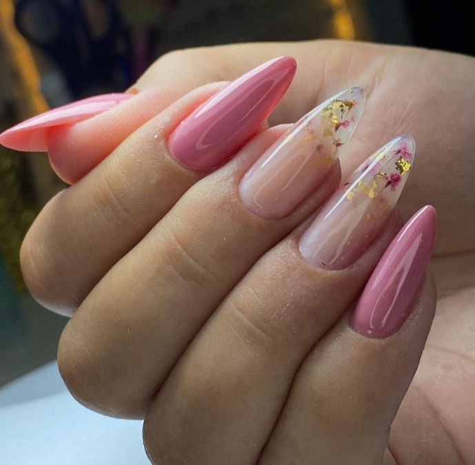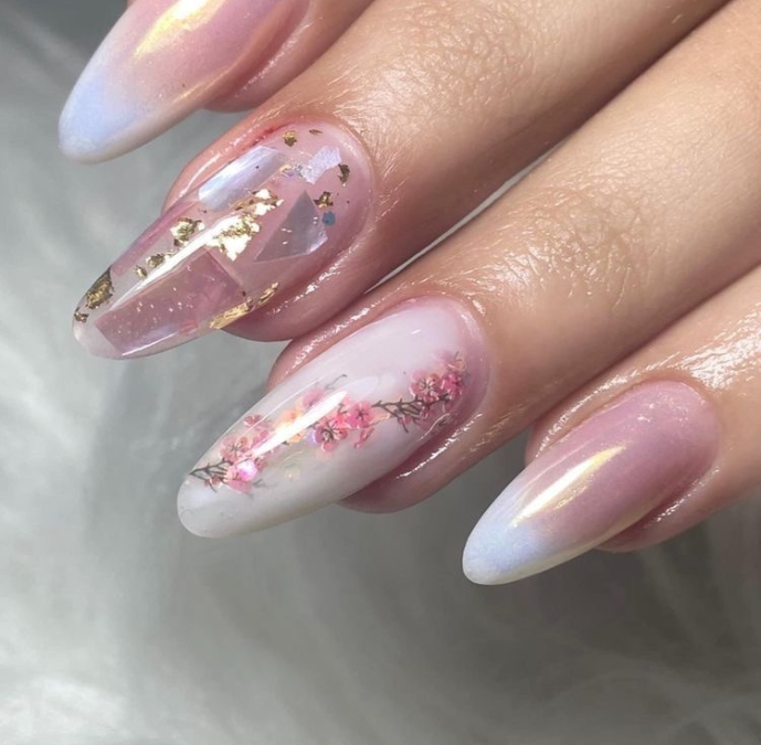 Delicate pink blossoms appear to be swimming in the clear acrylic of these long nails that are set against the background of a gentle white ombré. Flecks of gold leaf bring the feeling of luxury to it as they are the pieces that remind of hidden treasures in a secret garden. This design is ideal for those who have the spring in their hearts and is perfect with the flowy, romantic garment.