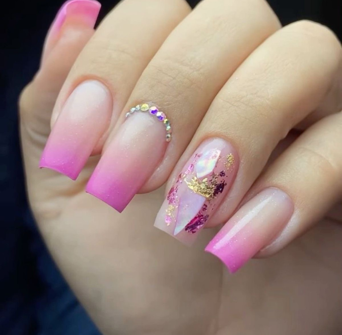 A gentle transition of pink to clear is the primary appearance on the nails and that has been highlighted with beautiful gold leaves and tiny beads which are combined to form a soft serenade to the eye. The main one among the nails is placed with bigger glitters looking like pieces of rose gold among a waterdrop of sparkling glitter. This long coffin style is perfect for the girls who love their femininity in a more subtle way and can be matched beautifully with soft pastel colors or light, breathable fabrics.