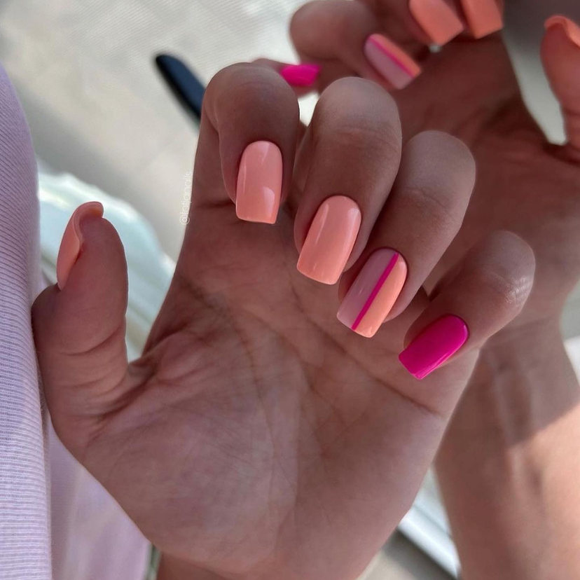 In case you are not resignation, tiny or small very short gel-style manicure yes, be it is this one a flying peach base & pink line is the one that you will be complemented with. Wear confidence and grace as soft peach and brilliant pink really look together. The matte finish on the peach hue indeed is a twist of modernity, while the glossy pink stripe creates a texture contrast that is very interesting. This artwork illustrates the fact that color and motion can be simple yet still have a profound effect.