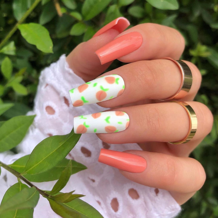 A peach color is the most eye-catching choice for the nail salon. In this design, the peach fruit is shown with just one accent nail. A single fruity accent nail is a hint of the sunny, season’s natural beauty and looks great on the acrylic nail trend. And yet it’s such a simple style, but still exquisite.
