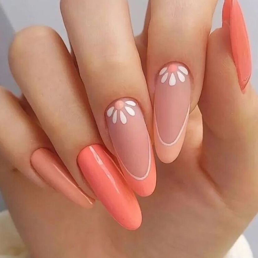 This design draws its vibes from the beauty of coral reefs, where bright coral nails are highlighted by the white one with soft coral patterns. The pattern looks like the easy sway of corals in the sea, thus the bright and fresh color combo makes it both calm and thrilling, a must-try for the ones that want to stand out in the coming summer.