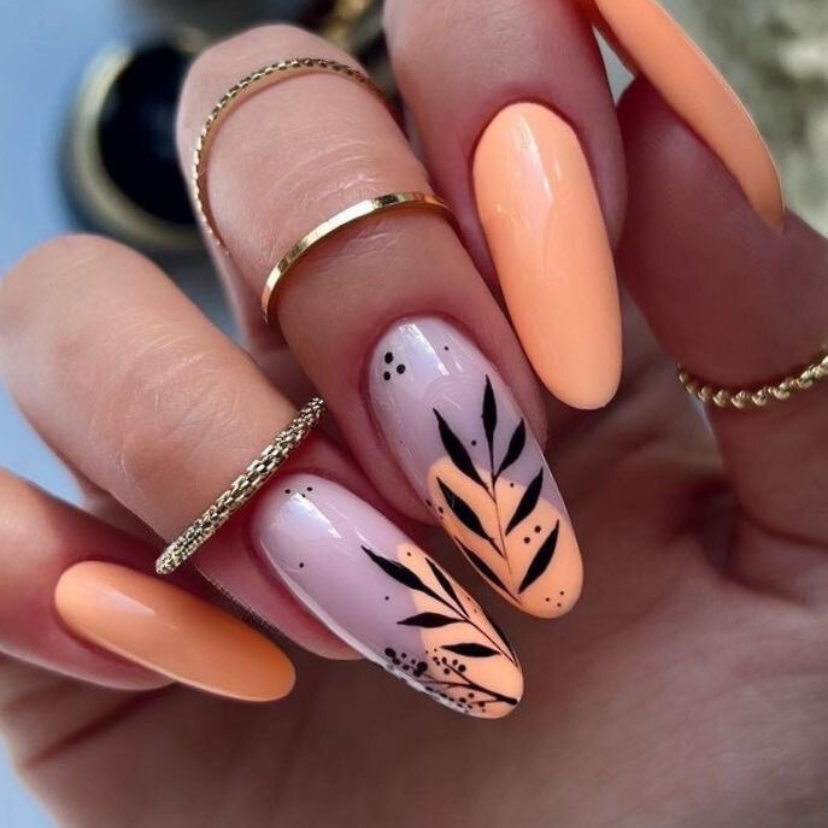 Nail paint or even cosmetics have always been highly visible and extensive for individuals who follow fashion. This particular nail art is a blend of imagination and a daring spirit and is one of the newest styles. Mustering the talents of a professional, the design involves using a solid peach for some nails and an impressive black lightbotanical pattern on the remaining ones, on a see-through background.About 70% of this product is biodegradable, while the other 30% is recyclable depending on the package condition, the size of the material, and local guidelines. This artistic expression with gel nails is drawn from the current trend, the black accents define the nails boldly and complement each other beautifully. Peach is the choice for this summer, which is a medium color and a warm temperature.
