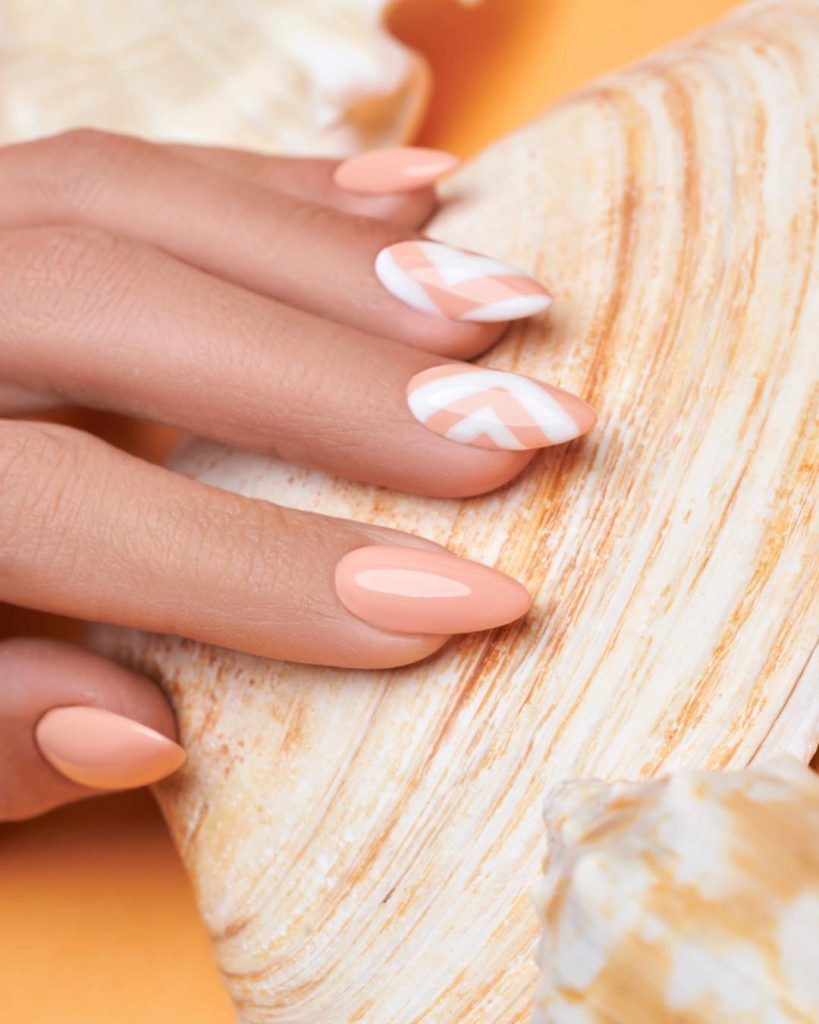 Pastel peach and whitish color patterns are perfectly chosen on this manicure. Subtle yet chic, this look is thus achieved. The design choices of the opposing solid color and the patterned nails create a visual contrast that is both modern and simple. Where art meets the minimalist, this nailart is the summertime must have to accompany with a shortcut very well.