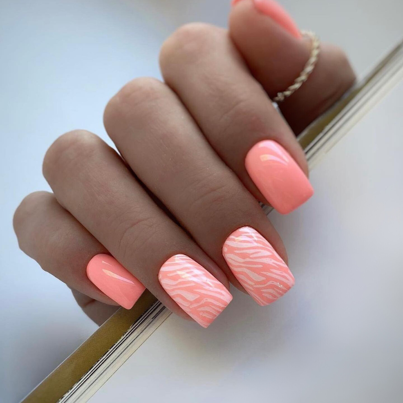 Adorning these short gel nails with a tropical pattern is like taking them to the exotic places with a simple peach backdrop. The soft zebra-like stripes in a slightly lighter peach provide a subtle yet impactful nod to the wild side of summer. The design is a beautiful option for people who like to wear short nails but still want to be trendy.
