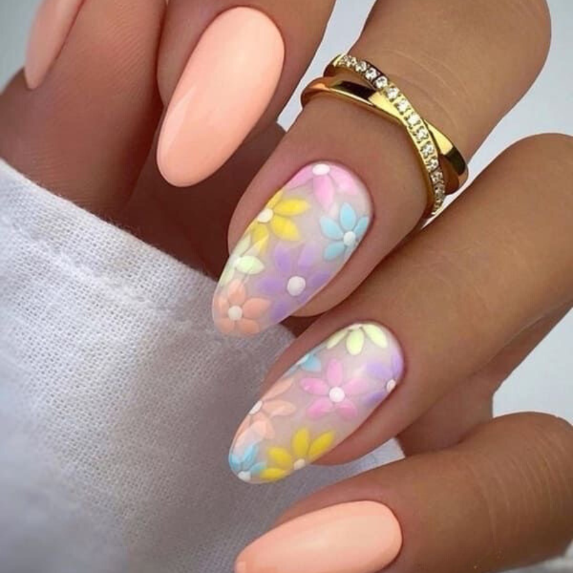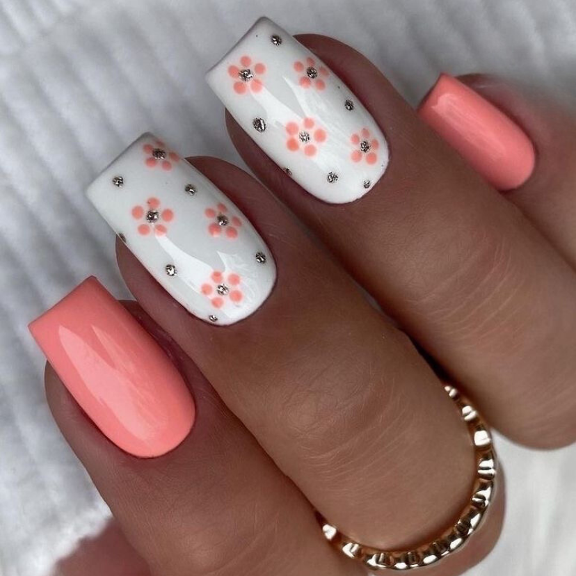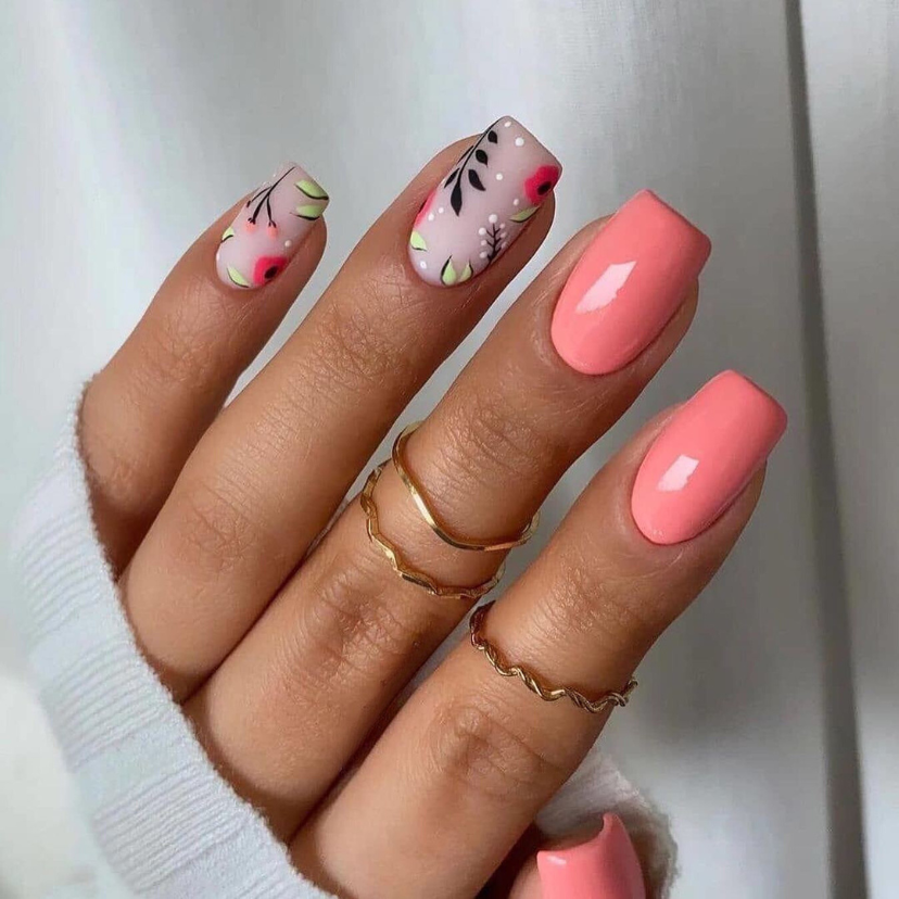 This is a stylish and fresh idea that consists of soft peach color and beautiful floral art design. The accent nails come with tiny flowers as a design and are adorned with shimmering stones that give off a playful summer spirit. It is a design that is simple and yet detailed, perfect for those who like to manifest their femininity.