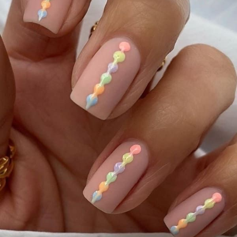 This creative design features candy-like nails as the dominant aspect. The concept of decorating the surface of a soft pink base with colorful beads represents a playful style. Bruinwn and blue polka dots on the base surface present this design as a youth-to-go pattern, but it might be changed to the trend of 2024.