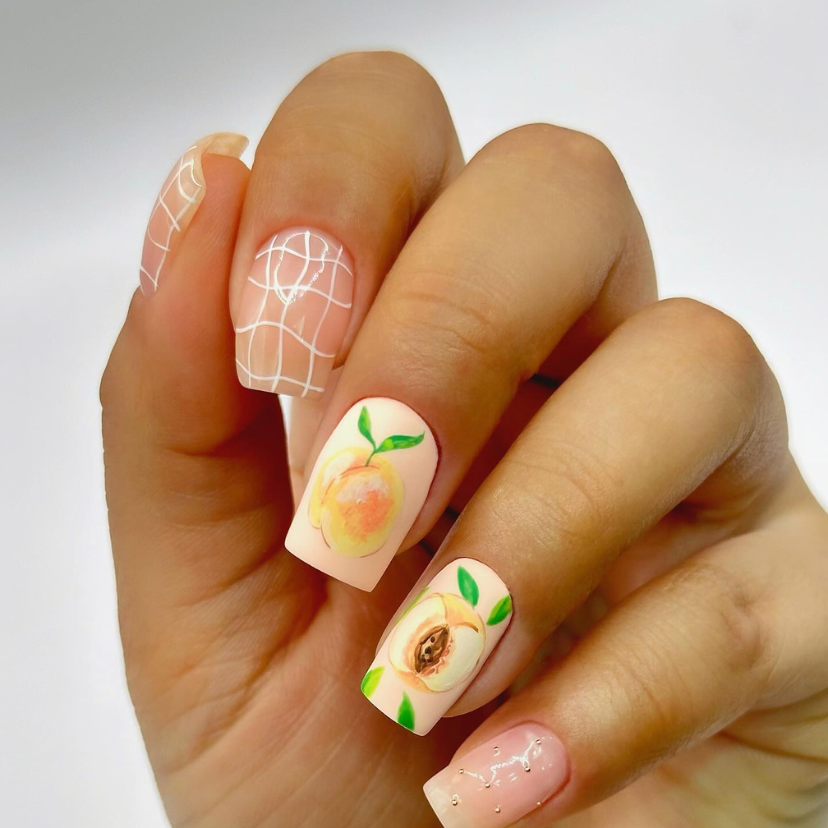 This nail art is both abstract and realistic, featuring a soft peach background with a layer of white grid lines and detailed with perfectly drawn peaches. The layout of geometric patterns and fruit images is a strong tick of artistic invention and it is one of the seasonal must-haves. The design is a great choice for those who like their nails to be talk about summer tropics and the abundance of fruits.