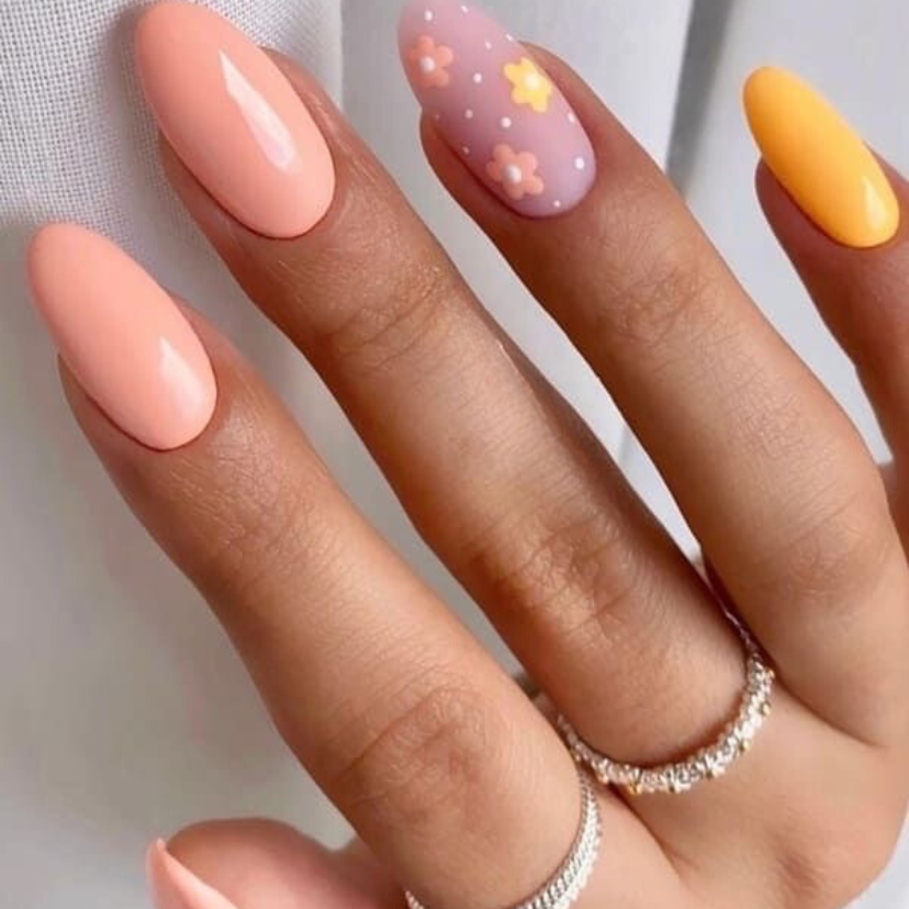 The fact that this sorbet nail art idea is so amazing is that it can be easily worn in hot summer days. The dominant color in the design scheme is creamy peach with a bright yellow lemony as a contrast color. On one of the nails, there is a colorful dotted design that imitates the effect of several balls of ice cream on the nails beside it. In the summery treatment, an uncomplicated but beautiful design symbolizes summer desserts and 2024 fashion trends altogether.