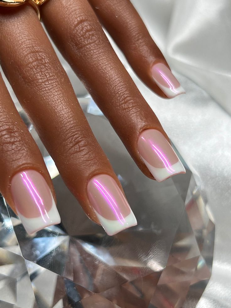 This design captures a beautiful square nail look with a subtle yet striking pink and white combination. The chrome-like iridescence on top of the nails gives a radiant glow that catches the light just right. Perfect for those who want something elegant but not overly bold, this style blends sophistication with a modern twist. The color gradient from pink to white adds depth, and the chrome finish makes it perfect for both casual and more formal settings. It’s a fabulous option for a wedding or even a DIY night out with friends. Keeping the nails short helps maintain a clean and manageable look that’s ideal for daily wear, yet polished enough for special occasions.