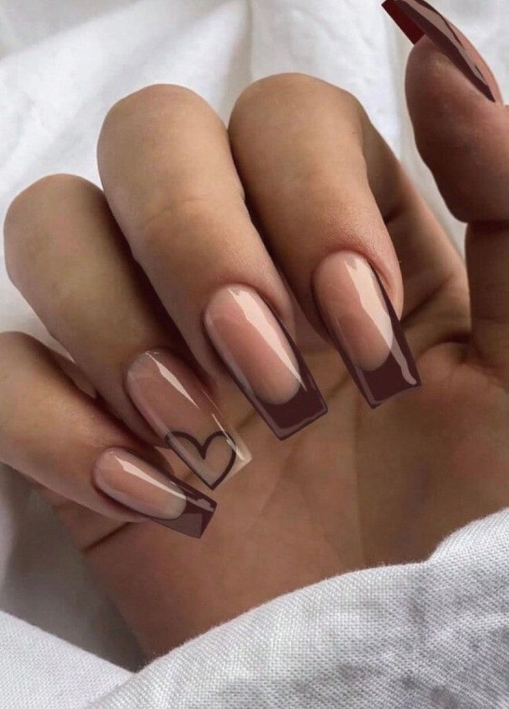 For a more understated but refined look, this square nail design takes the classic French manicure and gives it a sophisticated twist with brown tips. The color is warm, luxurious, and perfect for the colder seasons, offering a sleek look without being overly dramatic. The accent of a small heart design on the ring finger adds a playful and sweet touch. This look is ideal for women who prefer a minimalist yet impactful style. The square shape of the nails balances the elegance with an edgy feel, making it a great choice for professional settings or even as a wedding guest nail option. Pair it with neutral tones in your wardrobe for a seamless, polished look.