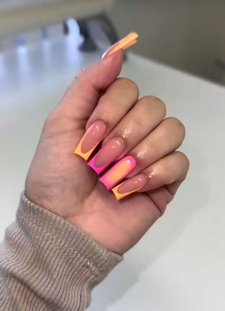 If you’re looking to embrace bold and bright, these neon pink and orange nails are your answer. This square nail design features a fun and modern ombre effect that transitions from a soft pink to a vibrant neon orange. The square tips give the nails a sturdy and chic structure, while the playful color combination adds a dynamic flair. These nails are perfect for summer festivals, beach days, or simply for those who aren’t afraid to experiment with vivid tones. The bold color makes it an excellent conversation starter, ideal for those who want their nails to express their personality.