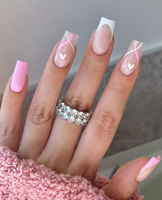 For a more romantic aesthetic, this nail design features soft pink and white swirls, complete with a heart motif on the ring finger. The soft pink and white tones make this design delicate and feminine, perfect for weddings or date nights. The swirls are subtle yet intricate, adding a level of sophistication without overpowering the look. The square shape ensures the nails remain structured and elegant, while the heart detail adds a touch of sentimentality. This design is ideal for brides, bridesmaids, or anyone looking to infuse a bit of romance into their nail art.