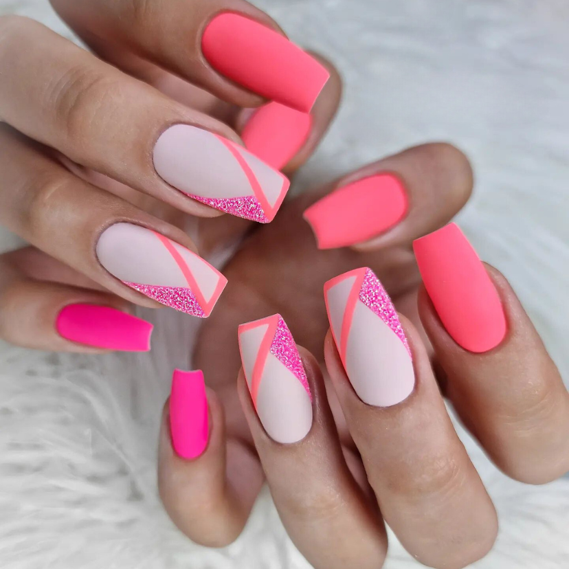 The coffin-shaped nails that are typical for those who are confident in their style are extremely bold.Wow, the bright neon pink is so much cooler than the white background it is on, and the glittery chevron pattern on one nail of each hand is so cool that it is even capturing the light and the eye.This design is not only a nail choice but also a discussion piece.