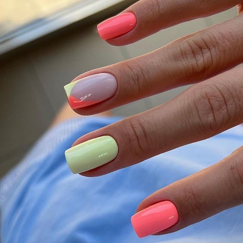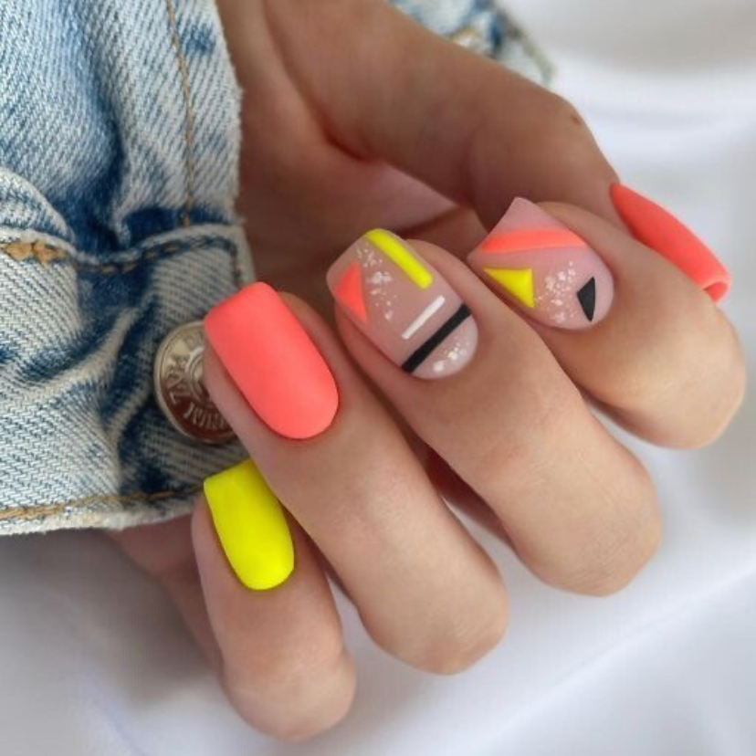 For those who are bold and audacious, these nails are a perfect combination of neon and muted tones with geometrical balance. The coral triangles and stripes are combined with the pastel pink, which brings a touch of loveliness, as well as with the superbly daring color of neon yellow, which creates the opposite side of the pastel paradigm. Neon green, which is the color of summer festivals, is the predominant shade in the sectional eclectic styles of the above-mentioned design.