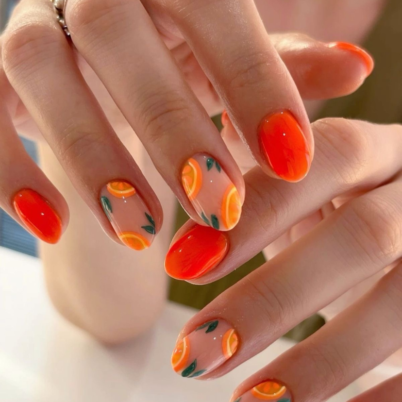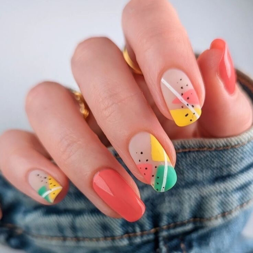 Bringing the spirit of an exotic holiday, these nails with a juicy coral base and aqua and green accents have been made into a fascinating fruit pattern. This design fully embodies the feeling of a summer beach drink, thereby it is a fitting option for those who would like to give their summer look a joyful and artistic touch.