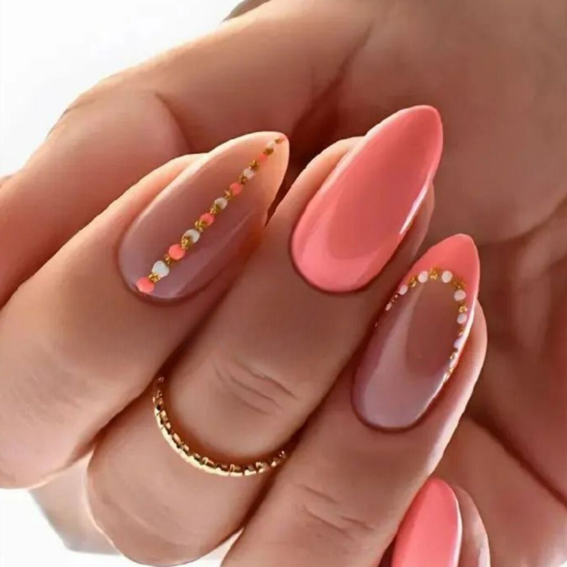 These almond-shaped nails are the perfect choice for those who love discreet luxury, as they are designed in a soft coral pink color and are adorned with a small line of delicate golden beads. That is a look that is utterly chic yet implies luxury in the most understated way, which is perfect for summer nights spent in the company of gentle breezes and warm golden sunsets.