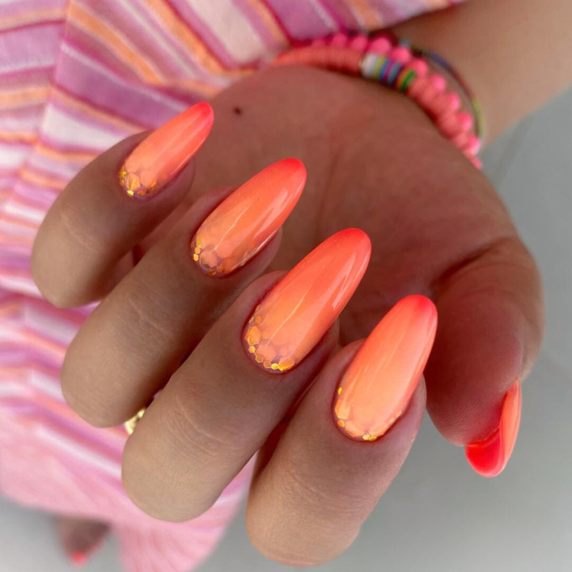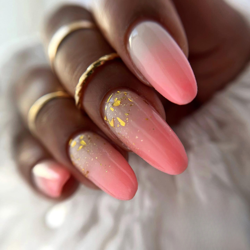 What a luxurious version of the ombre trend this design is. The nails transition from a deep coral shade to a pale pink one, and they are dusted with gold flakes that appear to be tiny sunbeams reflecting light. It is a design that is both low-key and lavish, absolutely suitable for nights demanding a little bit of glamour.