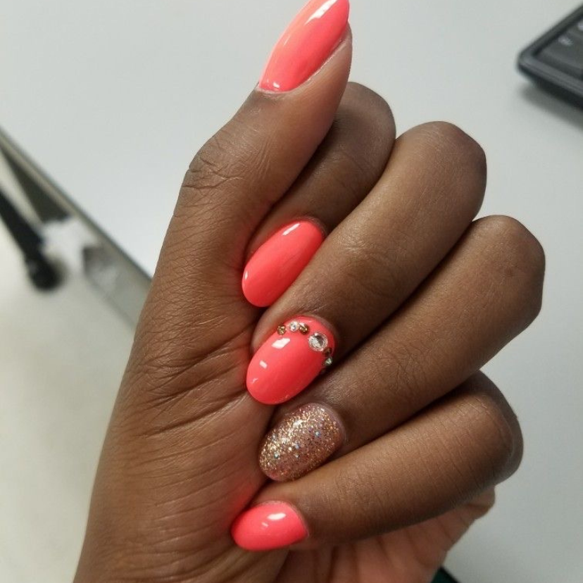 The style of this particular invention is in a way that this totally cool coral is the daily trend of it. The matte coral nails are play together with a single glitter-infused nail and a touch of gold hardware, which makes a more enlightened contrast. This design emphasizes both simple beauty and a little luxury, it actually is for those girls who like some glamour in their everyday life.