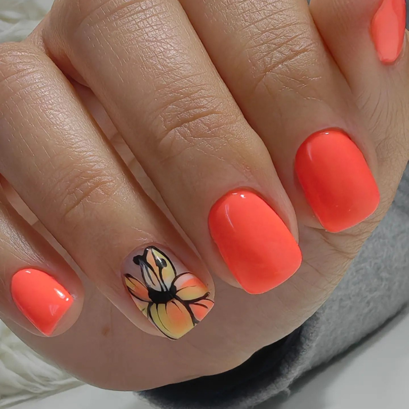 The central point is a solitary nail with a flower so breathtakingly intricate it seems as if it just bloomed amidst the vivid coral host. The design is a perfect embodiment of the summery flowers that fill up the garden and it will terrific with any floral summer dress.