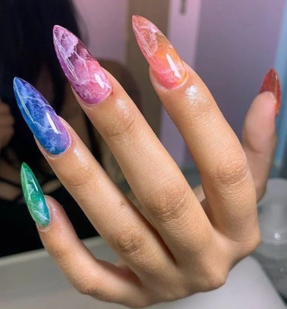 These stiletto nails take you to the universe, with a deep purple and blue and a sprinkle of cosmic dust. This long and bold design is for those who want their birthday to be as large as the universe. With a cute little black dress, these nails will be the night’s shiniest stars for sure.