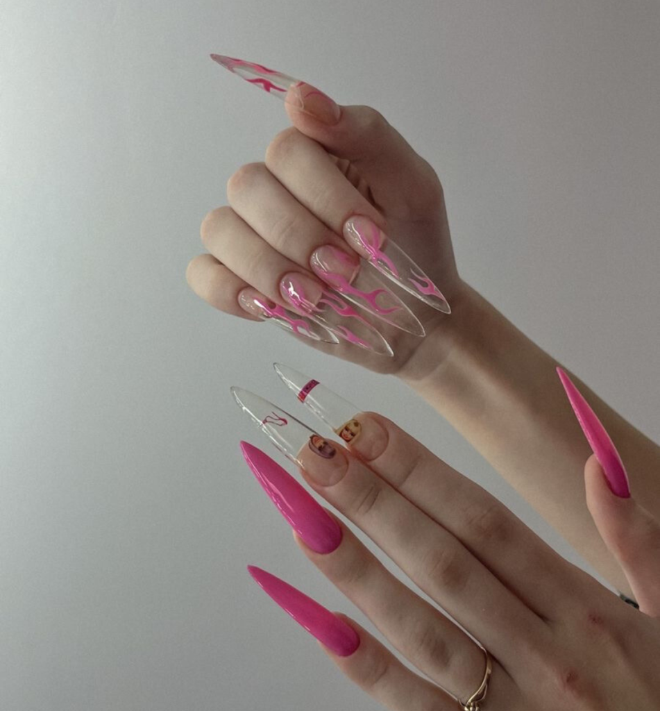 Denim is a classic material that never gets old, and it goes hand in hand with these long-stiletto acrylic nails. The design expresses the true spirit of classic denim with a bright, pink twist at the tips. It’s a fun yet elegant appearance that fits casual birthday brunch or a hanging out at night pretty much. These nails are nothing but cute and long, they come with a little of the youthful vibe to any outfit.