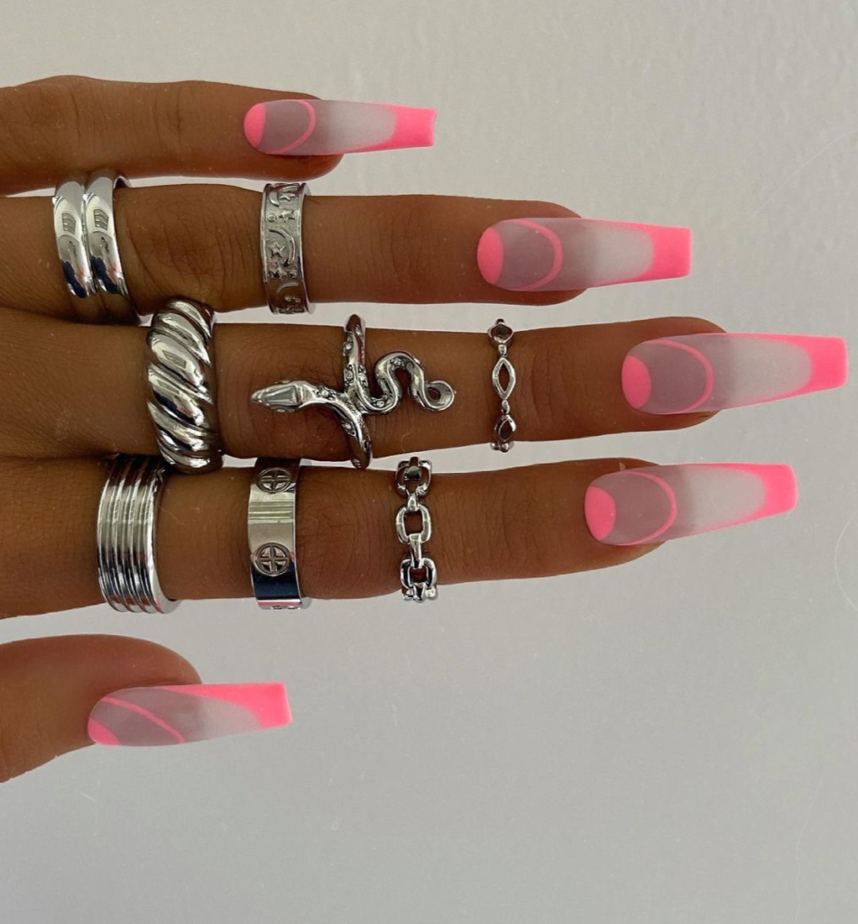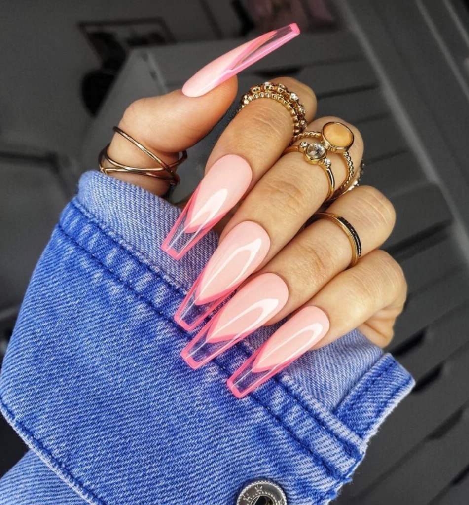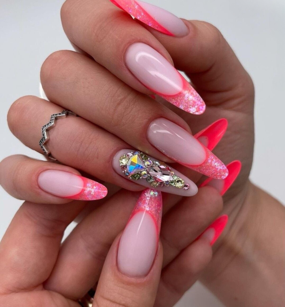 Long nails with neon pink tips make you the center of attraction wherever you are. With a bit of shimmer, they become a cute and daring option that will direct the attention of everybody to you. Whether you are dancing till dawn or having a birthday dinner, these nails say to you, ”Let’s celebrate the time in style.”