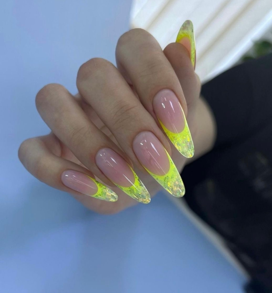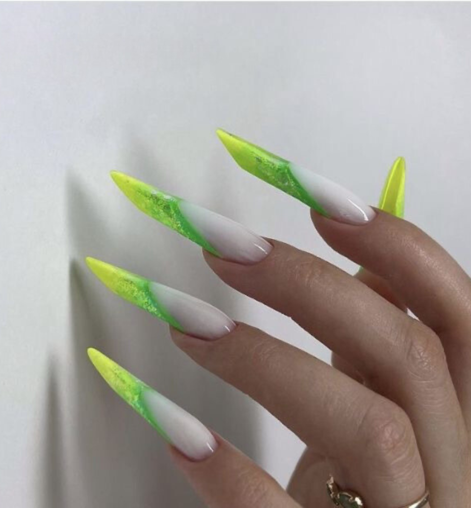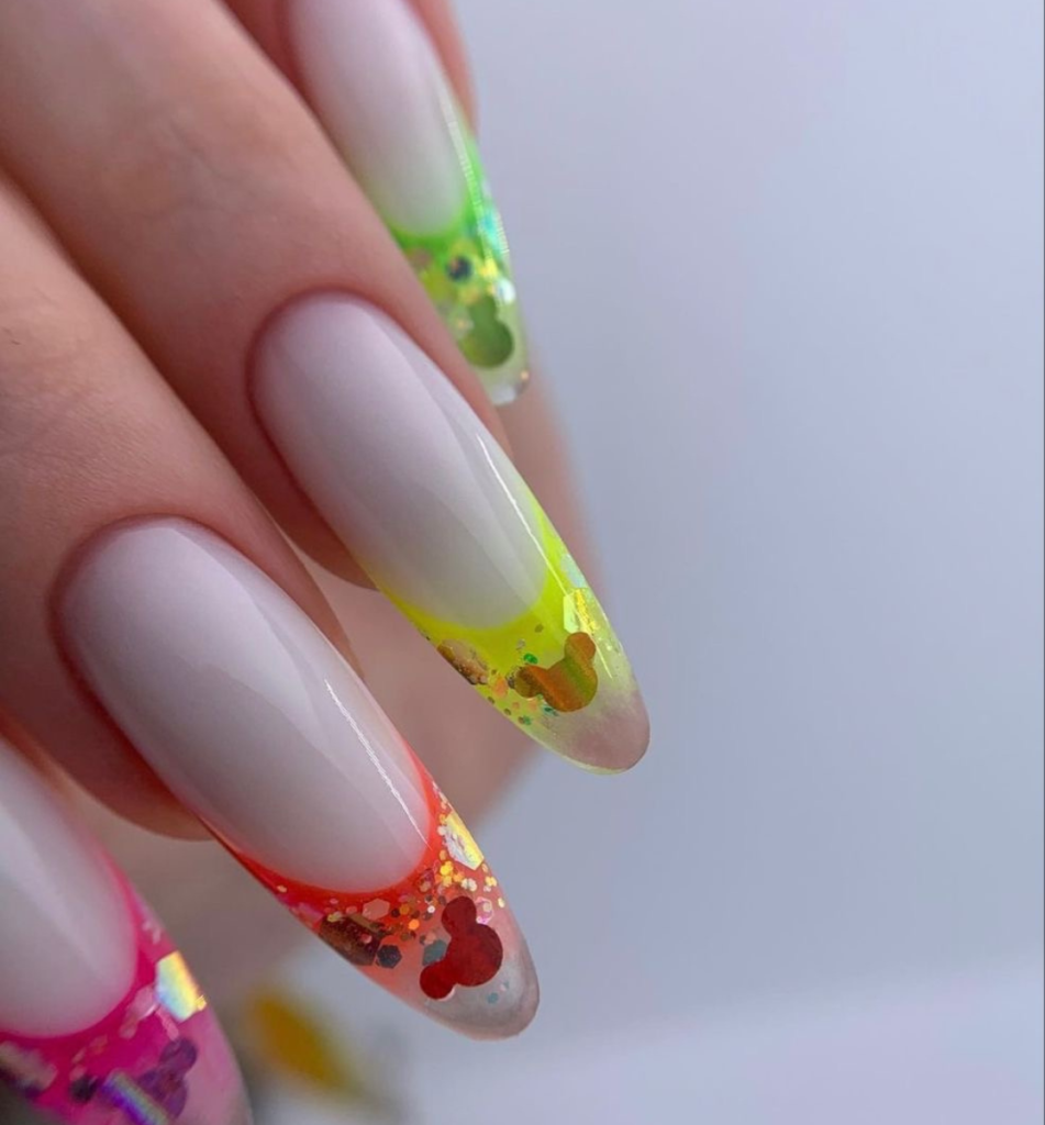 These acrylics are eye-catching and filled with bright colors, with a bright neon lime being the main highlight. The oval mussel with long and pointed tips is the best option for a wicked birthday girl who is all in for a statement. These nails are an excellent choice for a vibrant summer party and for sure they will be remembered as well as the party.