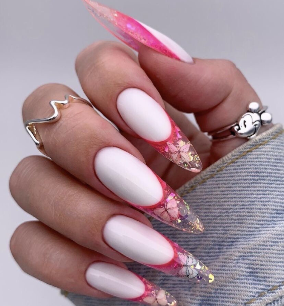 These spring inspired nails with their cute pink tips and charming cherry blossom designs are like the whispers of the season. Simultaneously, they are long, formal, and have a slight hint of nature’s creativity. They are ideal for a spring birthday, representing the beauty of the new beginning and the gentle touch of nature’s hand.