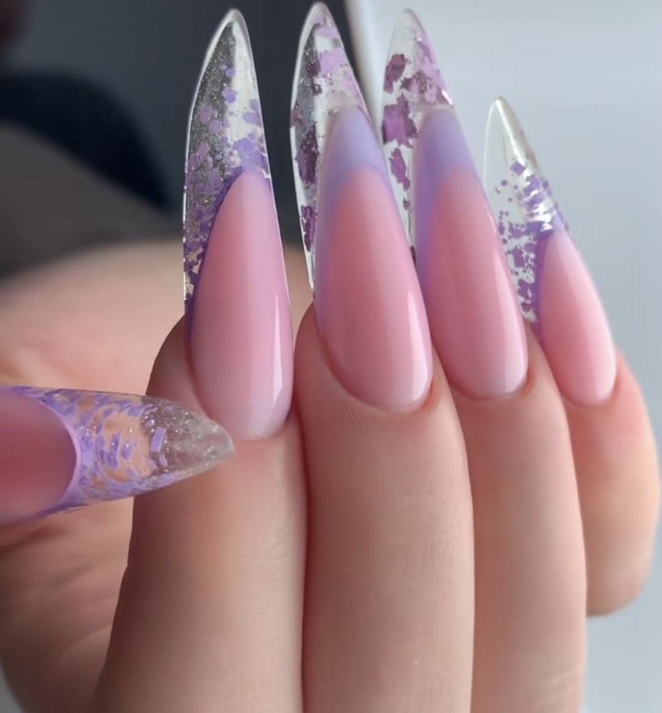These lengthy nails, which remind one of a blossoming garden in springtime, move from a light pink to a sprinkle of lavender and silver. They are the model of high fashion and are perfect for women who like a moderate and pretty nail style to say everything instead of loud. These nails represent a form of grace that can suit a peaceful and elegant birthday party.