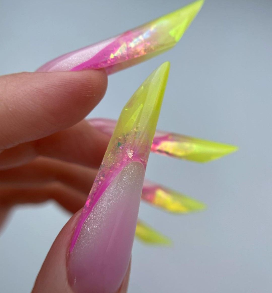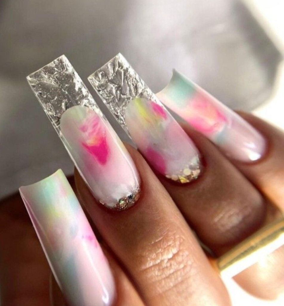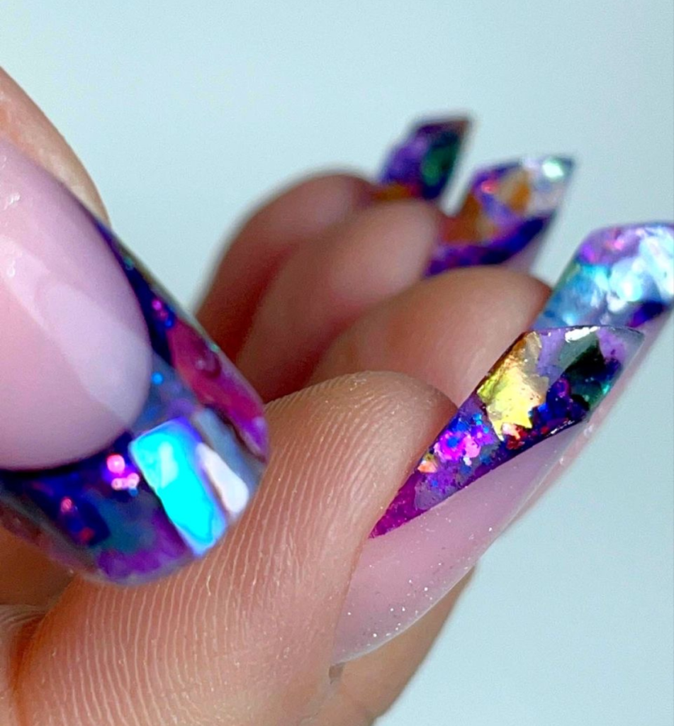 This is a wonderful long acrylics futuristic fantasy that goes with holographic shards enclosed in quantum acrylic. A holographic reflection of light from a disco ball at a party is its core definition. These are an out-of-the-box selection, especially for the birthday girl who wants to add a little extraordinary to her special day.