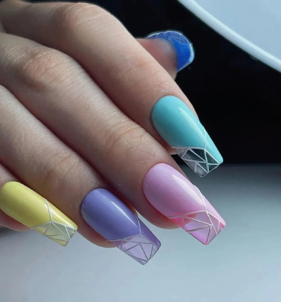 These nails are modern art above the tips with sharp geometric designs. The pastel colors give the look a cute and playful vibe while the clear accents add an edge. These long nails are ideal for a birthday girl who is proud of her individual style and they will definitely be a piece of conversation.