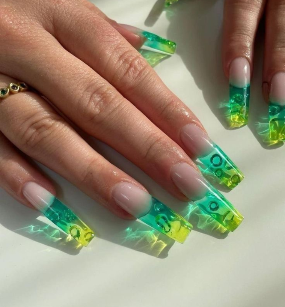 Think about how the fake glass of lemonade feels in your hands in the summer garden party, where your nails are a bright copy of the color of leaves around you. The plastic nails that are located in this article are the perfect combination of a bright green and a cheerful sun with a unique glass that is both cute and long enough to make a statement. Having small embedded details that reflect the rays of the sun, these nails instead of being an accessory, become the main highlight. Perfect for a summer event, they will surely intrigue people to talk about them.