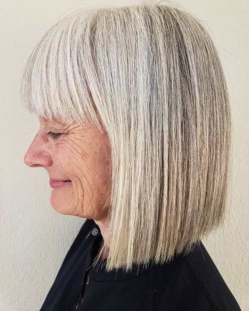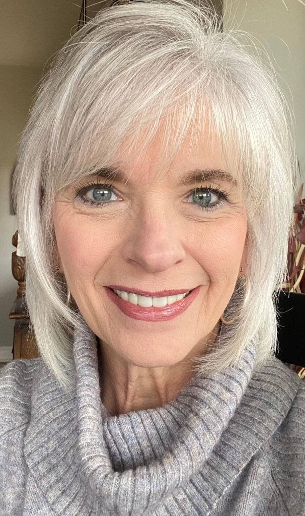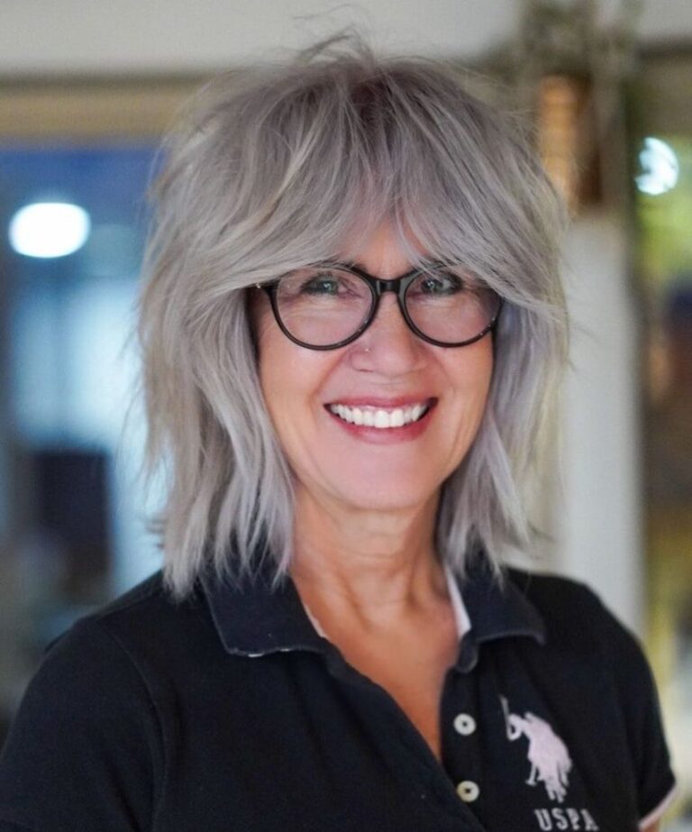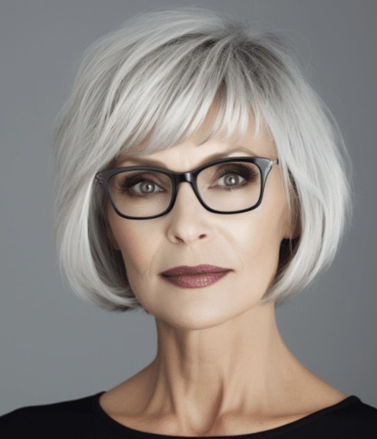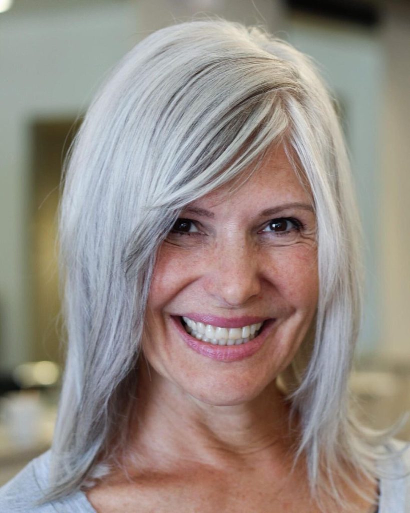 The medium-length mid-layer haircut that is carried by the smiling lady in the second shot is the classic example of the graceful aging process. The delicate layers make it look as if the hair is fluttering in the air and create a sense of youth, while the optional bangs bring a playful note to the look. This style can be adapted to different types of face shapes and it suits particularly those with eyeglasses as it distinctly balances the functional aspect and the styling part. It is a hairstyle that reflects the vibrant lifestyle of a woman who has reached her golden ages and chooses to wear her gray hair with dignity and self-assurance.