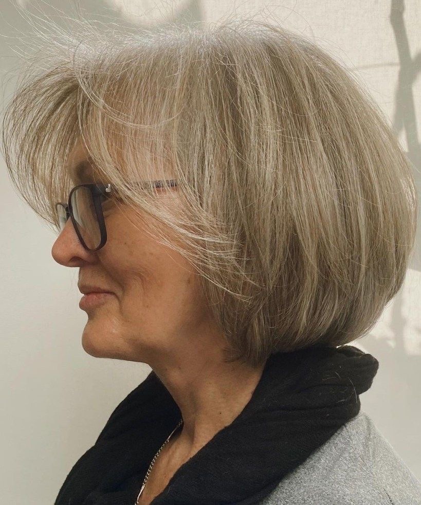This softly layered bob is a fabulous choice for women who want to have a mix of style and manageability. The side-swept bangs are expertly merged with the layers so that a modern and sophisticated look is created. This hairstyle is particularly appropriate for women with medium-length hair, as it helps to get more volume and movement without making the face look too crowded. With this haircut, you can also style the layers easily, whether you like to have a smooth finish or just a little bit of a relaxed look. It is the best option for a woman who is more mature and seeks to look both fashionable and young without spending much time in the mirror.