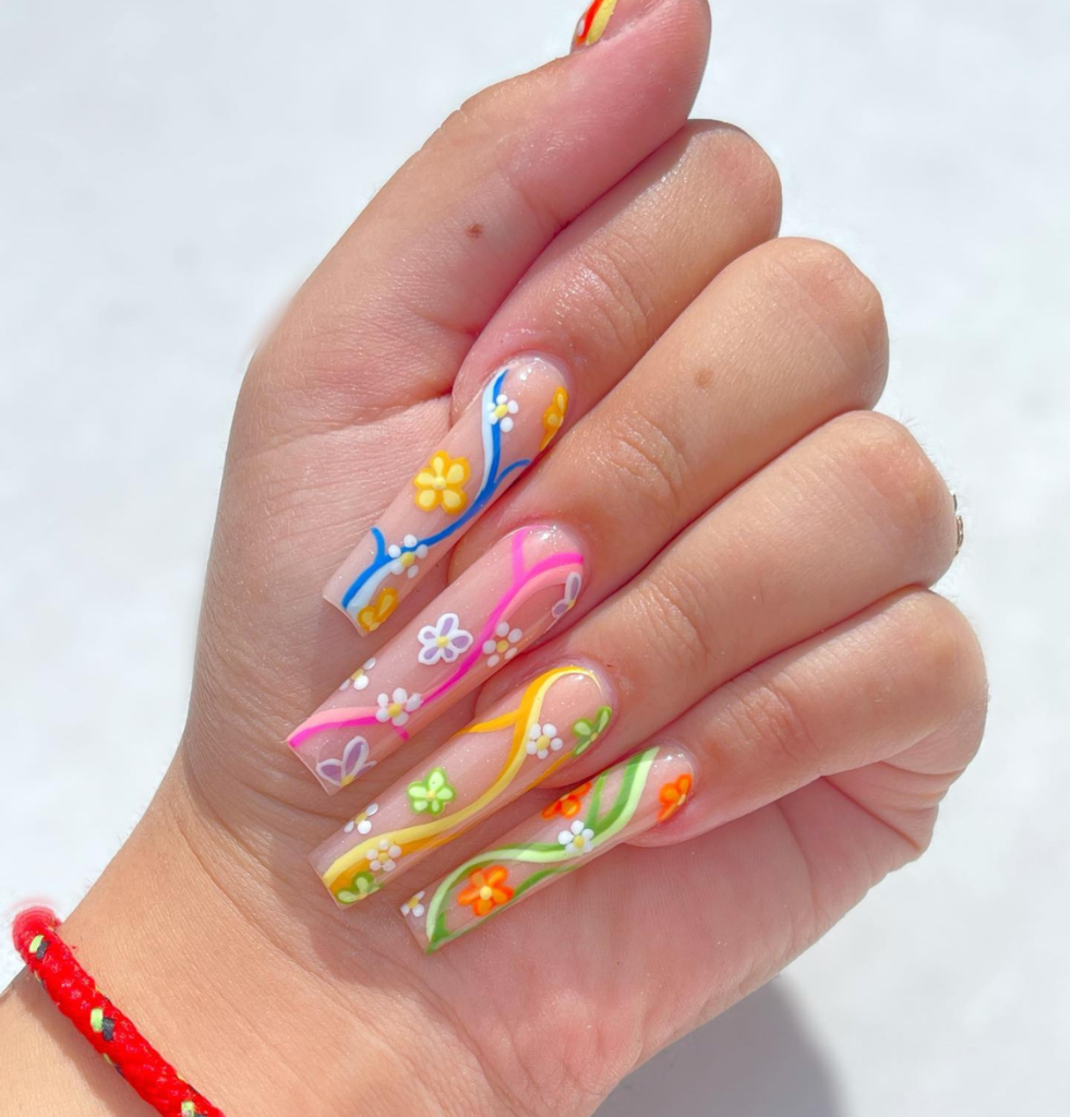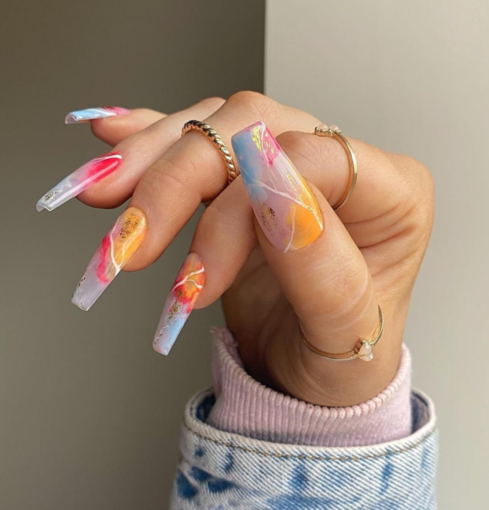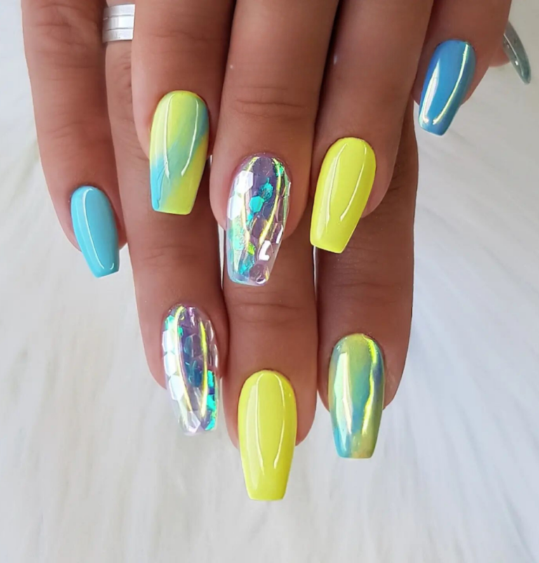 Transform your summer with these catchy coffin nails, which come in an array of neon colors and holographic accents that scatter the sun’s rays. They symbolize the bright summer vibes of music festivals and beach parties. To give these bold shades the full credit, pair them with a plain white t-shirt and denim shorts.