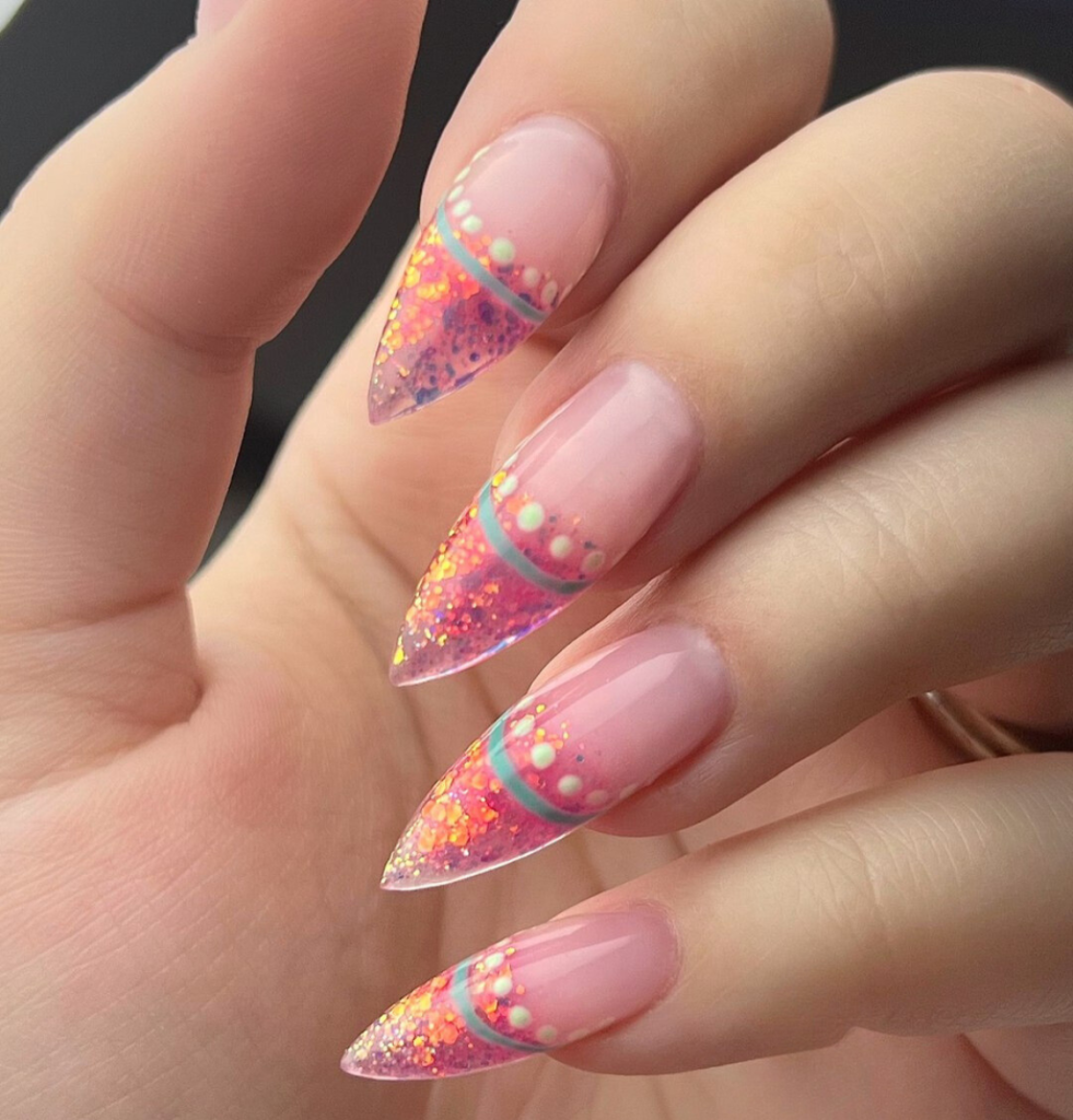 Whimsical souls will find these almond pink nails with a touch of glitter and little dots in the colors of a summer fair and cotton candy to be an allusion to the treasures of summer. The short and clean almond shape is the practical choice, which is why the nails are great for a day filled with activities or a casual brunch. For this look, all you need is a white linen sundress that would be just as cheerful and bubbly as your personality.