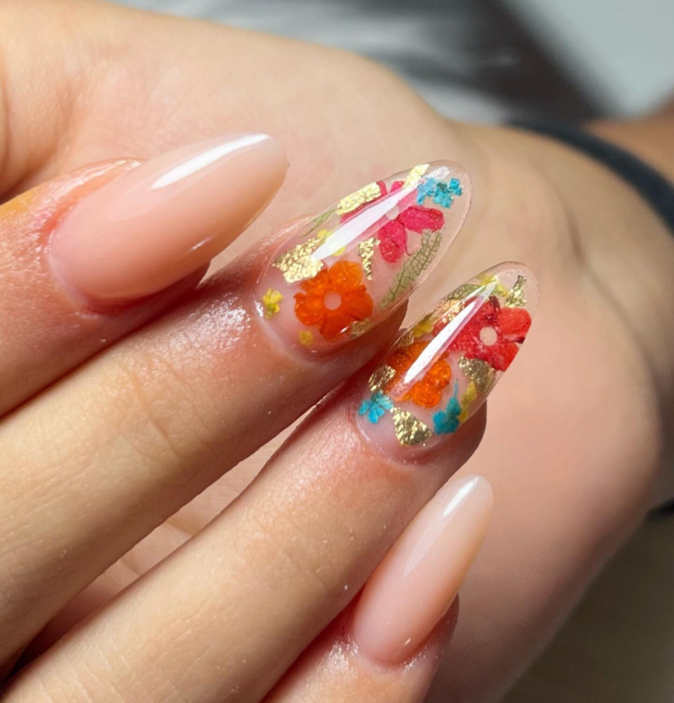These almond nails, located at the point of intersection of art and chic, are a canvas of the dreamy pastel shades and bright floral drawings. The glossy finish base lets the colors dazzle, while the fine gold foil adorning provides a sense of class. Ideal for those who choose tiny and simple but eye-catching designs, these nails mutually complete the look with polyester summer dresses and maroon, lightweight fabrics.