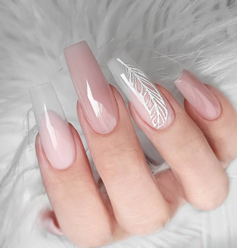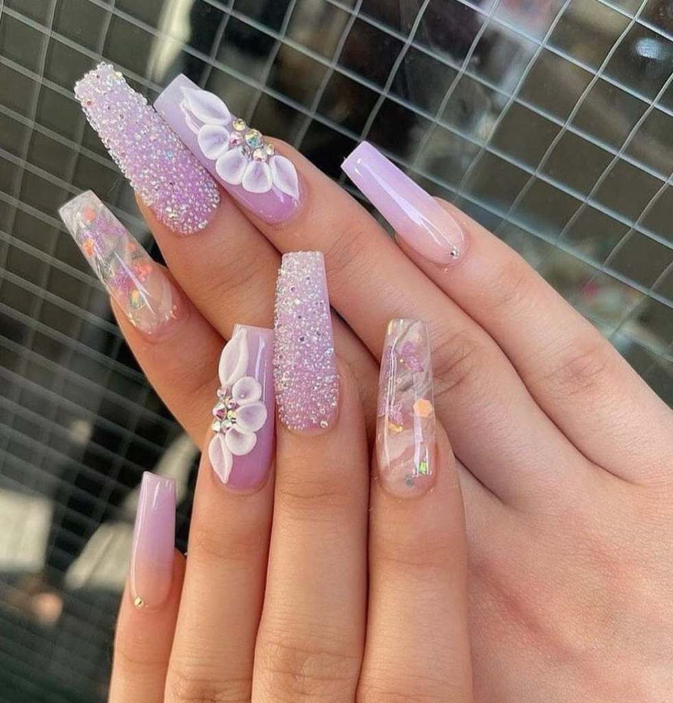 These almond acrylic nails are intricately gorgeous, in a lavender mist with a shiny nail placed with iridescent flakes enticing the sunlight and reflect it rightly. These are just right for a woman who is all about minimalistic beauty with a twist of art. A soft ruffled blouse and tailored pants will make the best pairing with these nails, which can nicely sit on her professional look but with a playful touch.