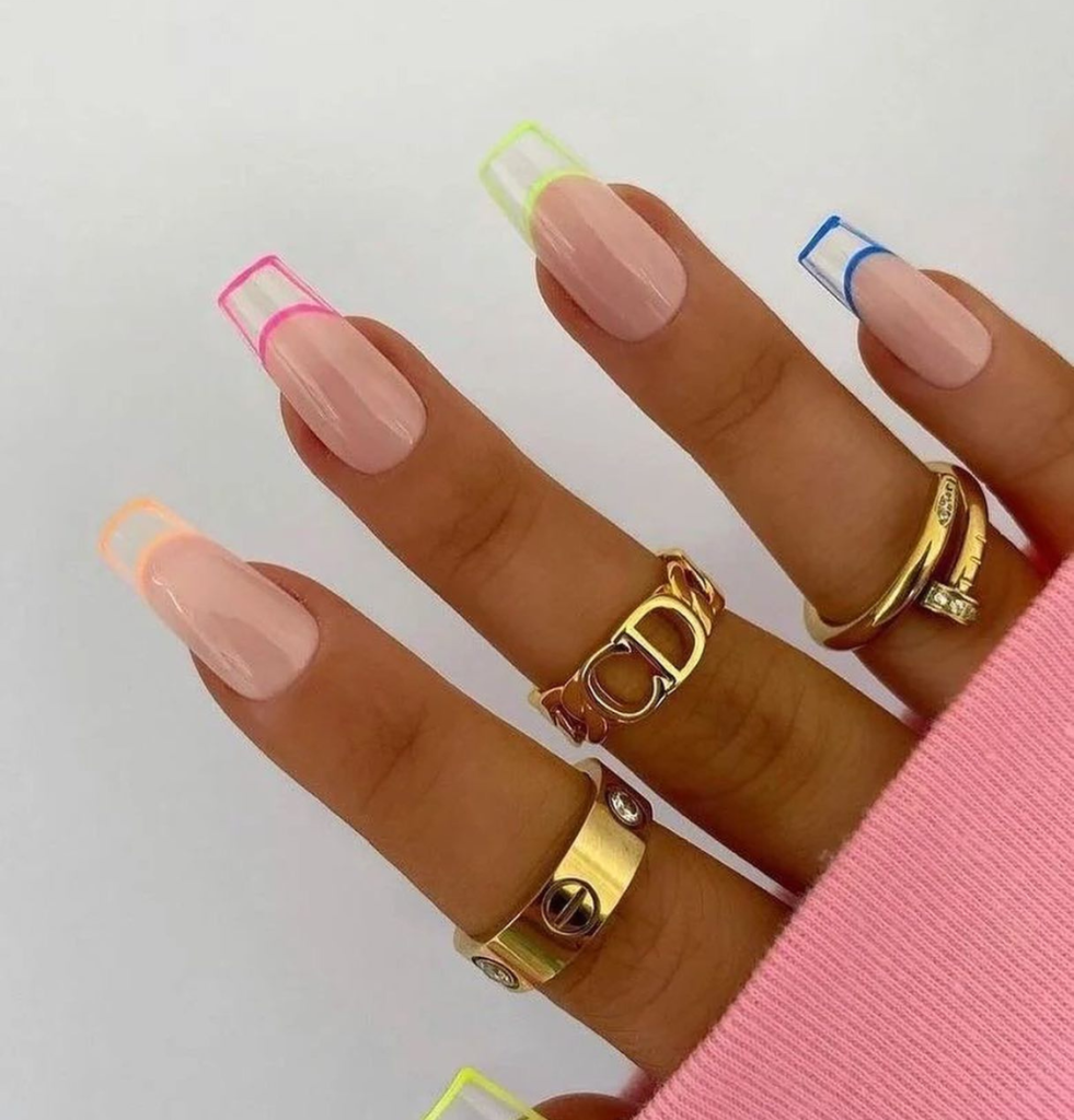 These nails are for sure rebellious and very bright and have neon tips on a short square base. The color that shorts the vivid tips and the nude base is the contrast that is visually strong while it is simple enough for the daily outfit. These nails would most likely be a great addition to a monochrome outfit because they will be the only accessory that speaks out characterize those.